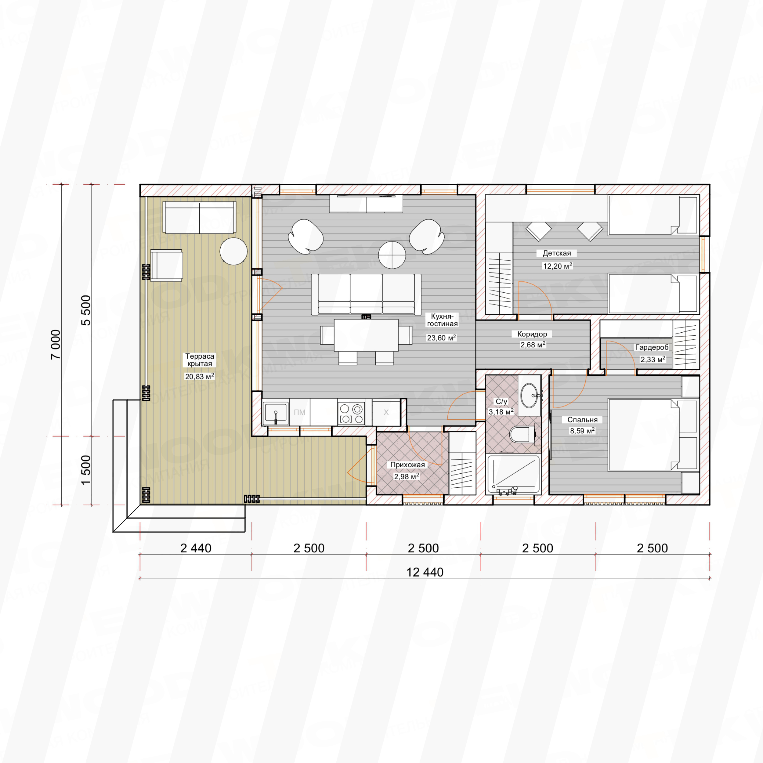 | ШхДхВ (без открытой террасы) | 7000х12440х3645 мм |