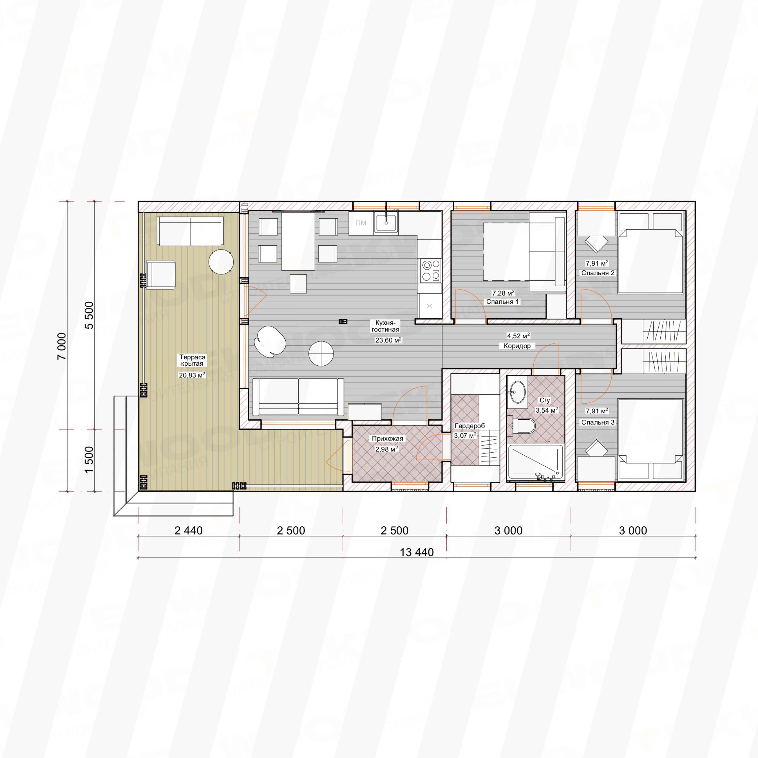 | ШхДхВ (без открытой террасы) | 7000х13440х3645 мм |